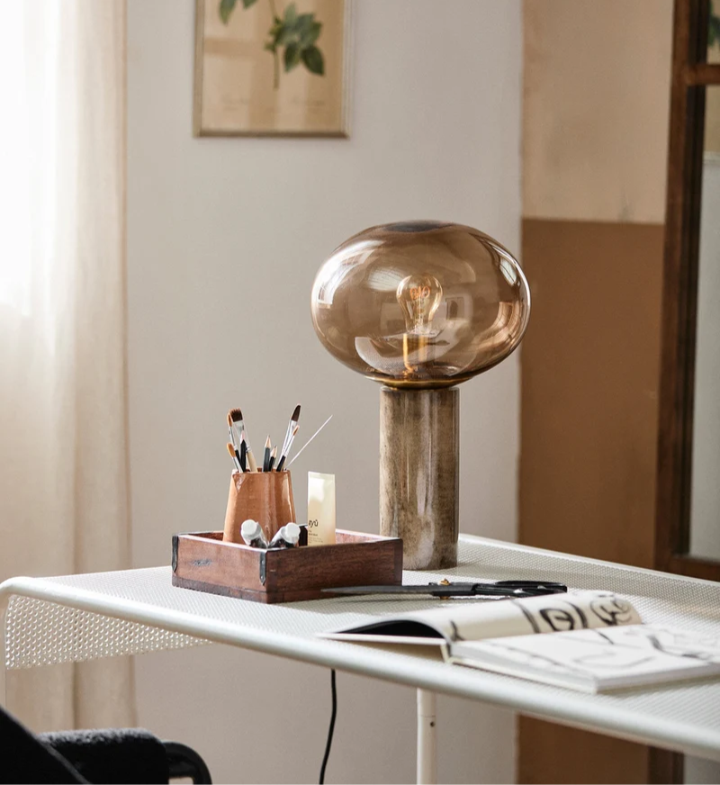 Настолна лампа BES е изработена от опушено стъкло и кафяв мрамор. Създава приятна, мека светлина. Дължината на кабела е 2 метра. Материал: Мрамор, опушено стъкло