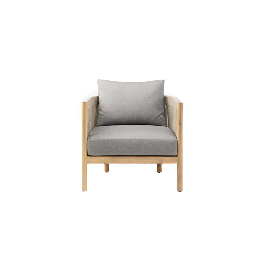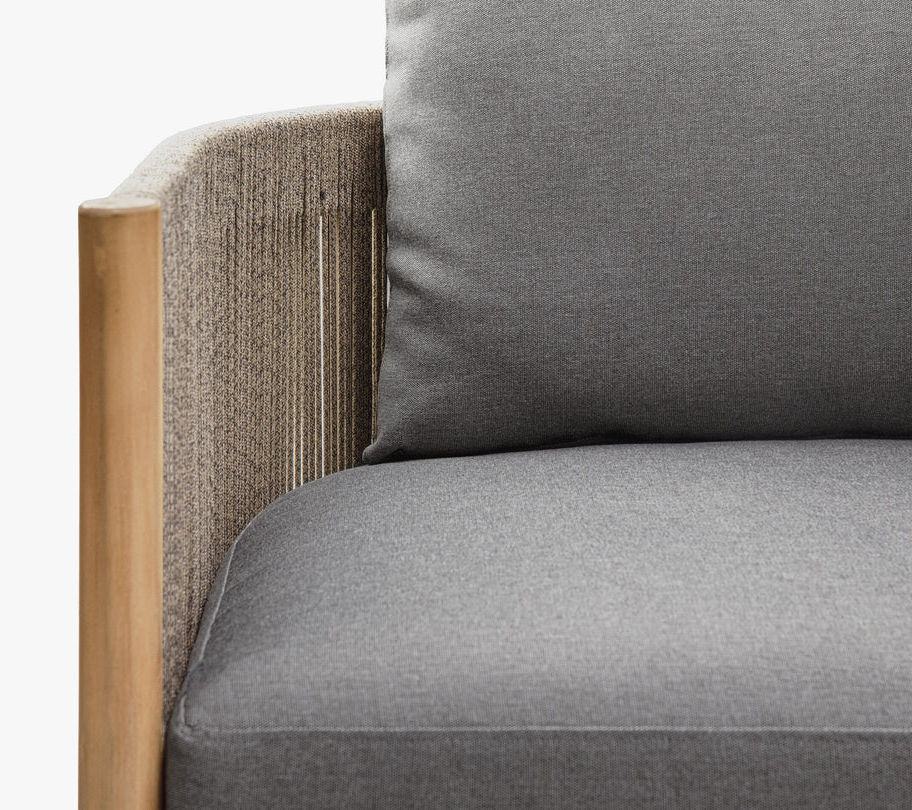 Градинското кресло Majorelle е с рамка от масивна акациева дървесина, детайли от плетени въжета и плюшени възглавници, създавайки стилен и удобен вариант за сядане в градинските пространства.