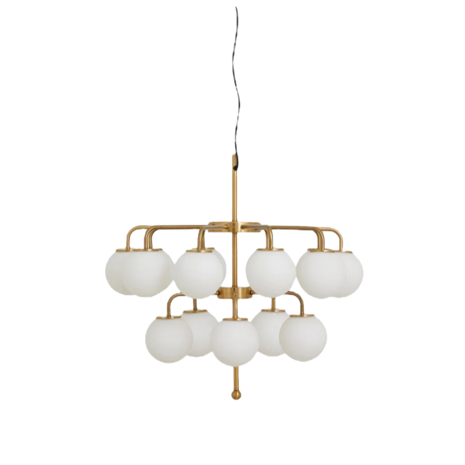 Полилеят PALMA е изработен от метал с цвят на месинг и кръгли бели стъклени куполи. 15-те сложно проектирани стъклени купола излъчват мека и приветлива светлина, създавайки атмосфера на изтънченост и стил. Независимо дали е поставен над маса за хранене, в хол или във фоайе, полилеят PALMA ще добави нотка на вечна елегантност към вашия дом.