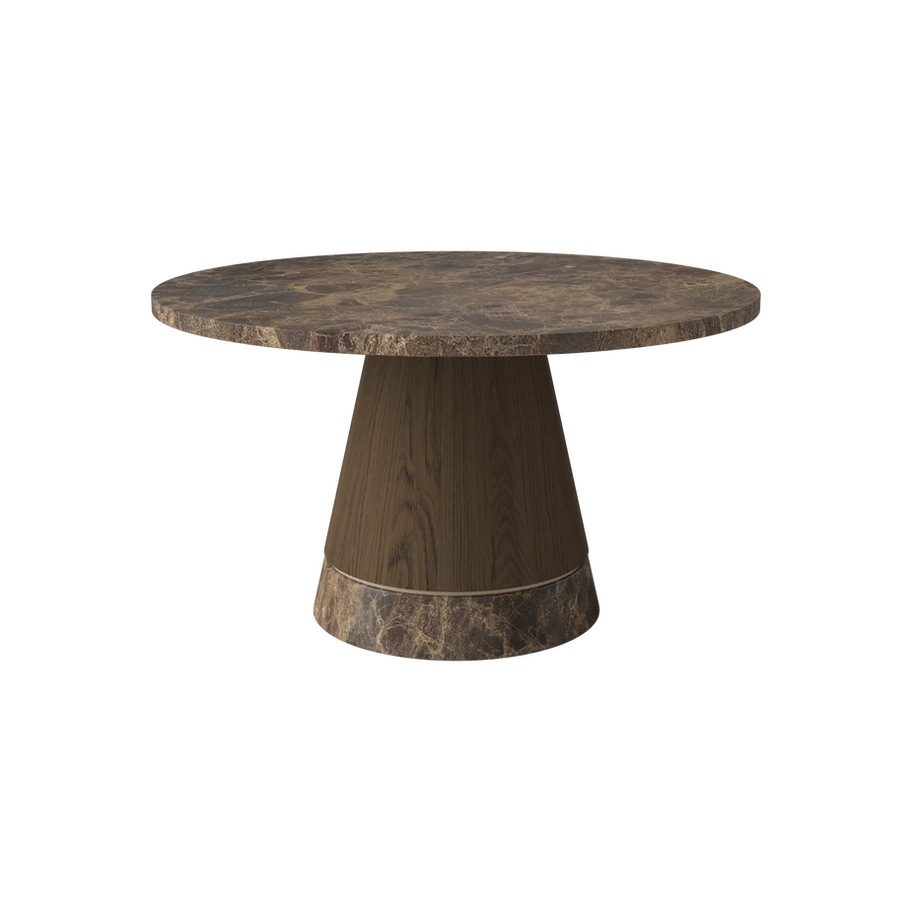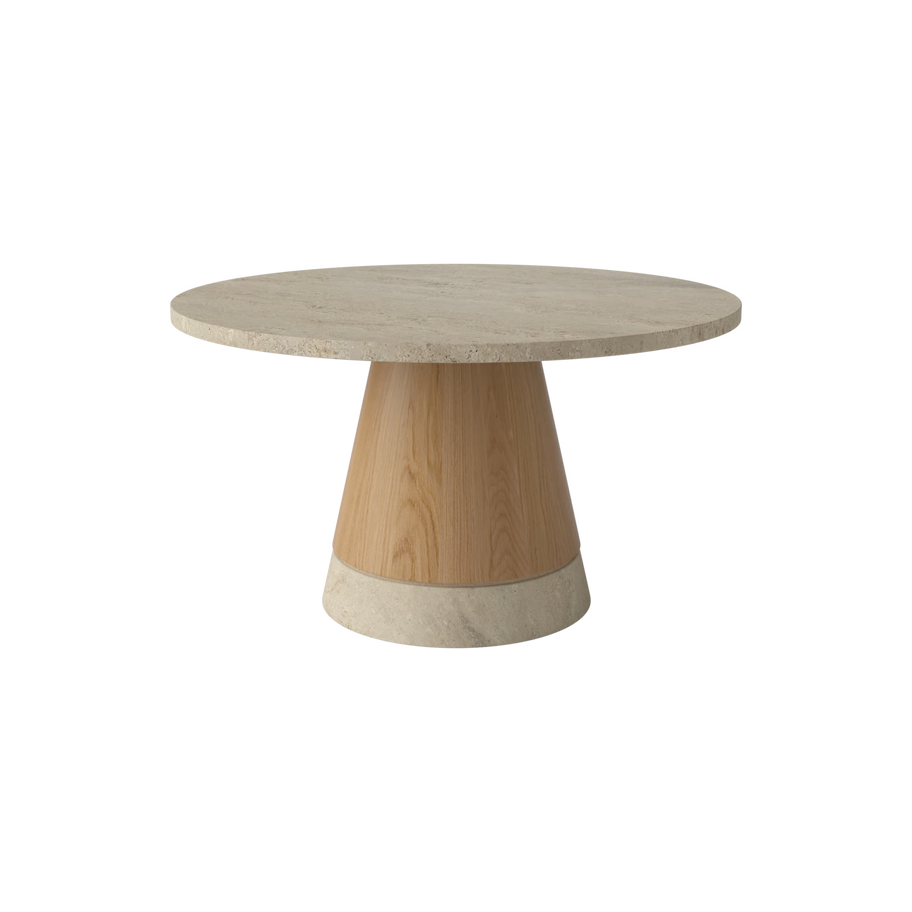 Внимателно подбраното дърво подчертава уникалните шарки на дървесните влакна, придавайки на дизайна спокойна и непреходна естетика. Следвайки класическите принципи на дизайна, конусовидната колона стабилно се опира на пода с масивна мраморна основа, която визуално „закотвя“ масата и създава усещане за стабилност и спокойствие. Предлага се в различни размери.