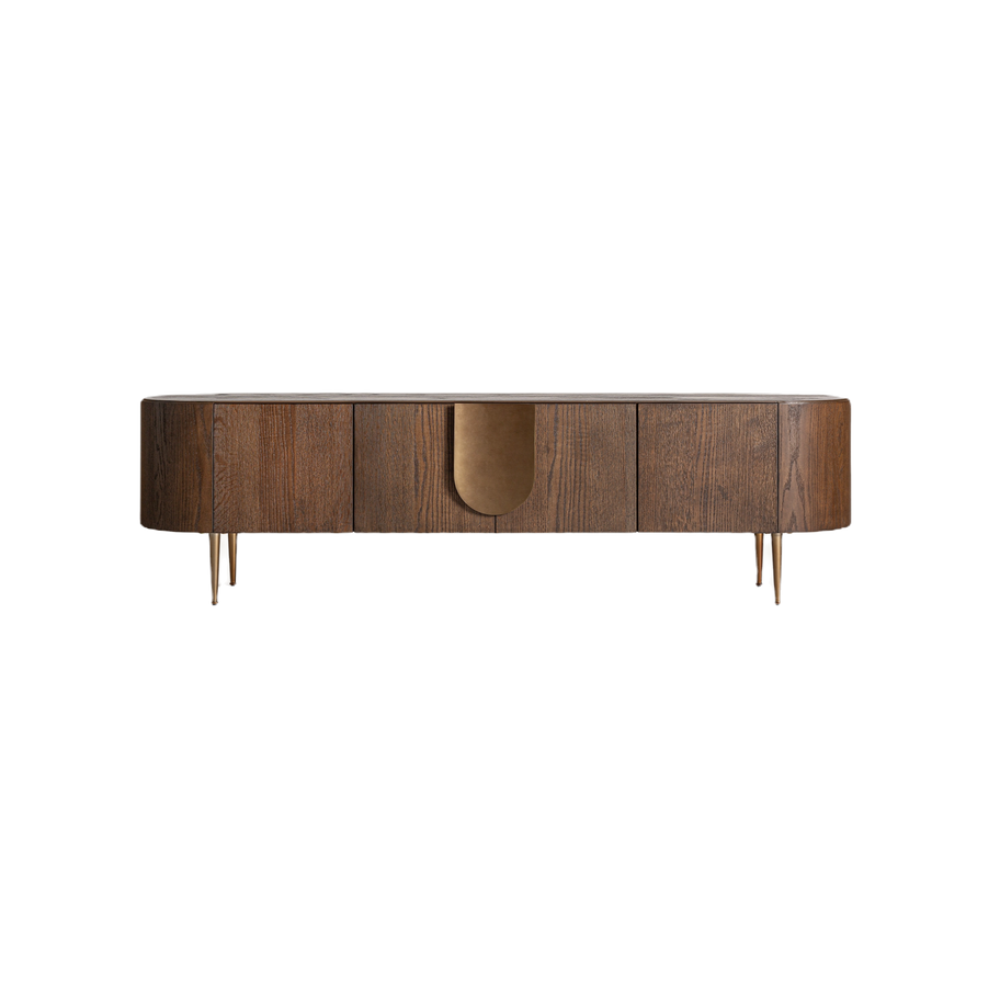 Този дизайн на VICAL внася баланс и стил: ТВ шкафът Treignac. Фурнирът му от оцветен дъб и конструкцията от матово златиста стомана предлагат изискана и функционална естетика. Мебел, която ще издигне всяка всекидневна.