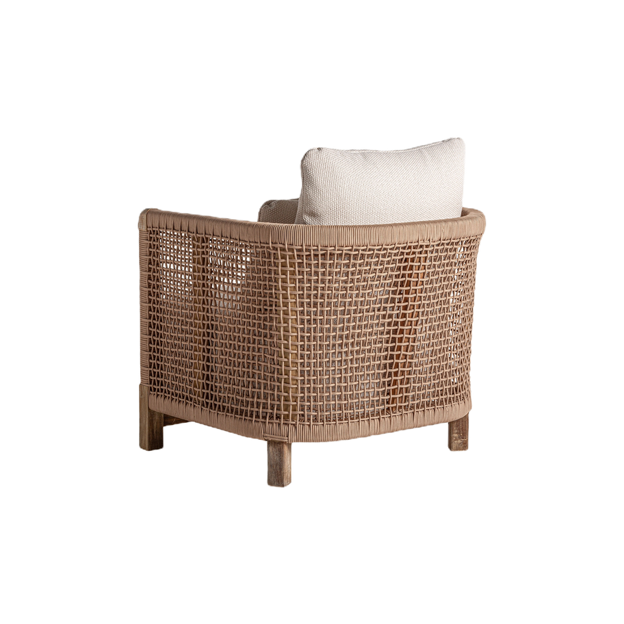 Елегантността на колекцията Trena е резултат от съчетаването на две концепции: лекота и устойчивост. Облегалката се оформя като обгръщащ елемент, който прегръща цялата конструкция и създава интимно пространство, в което въжето заема централно място. При дивана ратанът е разположен върху платформа от рециклирана тикова дървесина – конструкция, която го поддържа, повдига и придава усещане за деликатна, фина лекота.
