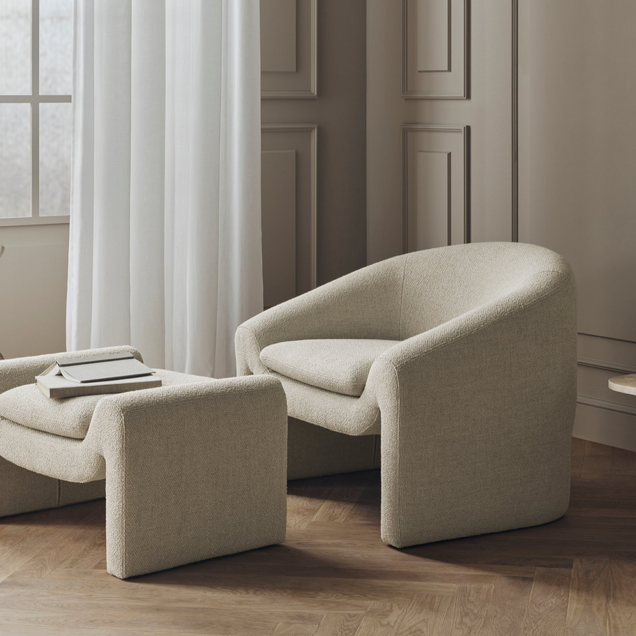 Invite an iconic armchair into your living room. The Mielo armchair and accompanying footstool have a sculptural lounge look with timeless, organic shapes. Created with a focus on comfort, character, and handcrafted European quality. With its open shape, it welcomes you to sit comfortably and relaxed, with a reversible seat cushion to extend its lifespan. Mielo is beautiful from every angle, complementing any contemporary interior, and will surely attract the attention of your guests. The model shown is upholstered in the standard Nantes fabric. Available in different colours and materials. Please note that selecting a different fabric will result in a price adjustment.