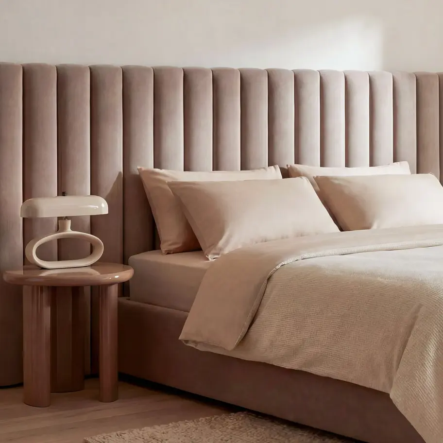 The Mistero double headboard impresses with its larger format and striking design. It creates a decorative focal point behind the bed, adding a cozy yet modern touch to your bedroom. Available in different sizes and fabrics.